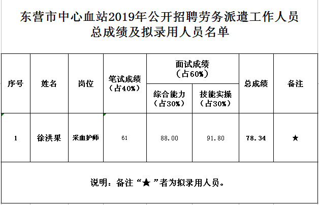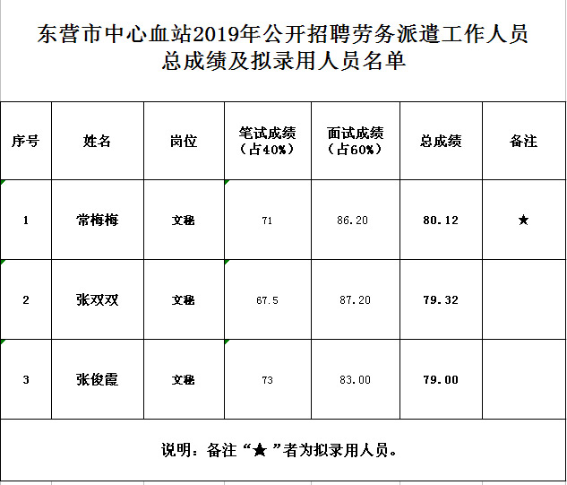 根據有關規(guī)定要求和本次招聘活動的統一安排,現將《東營市中心血站2019年公開招聘勞務派遣工作人員總成績及擬錄用人員名單》予以公布,請查閱。
